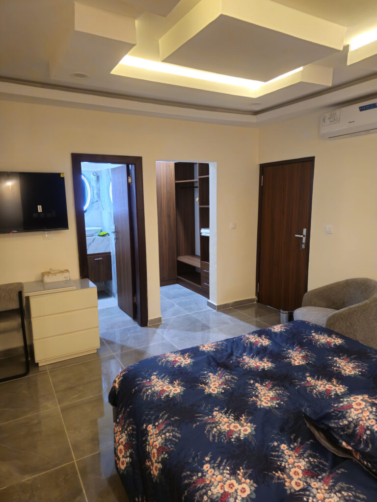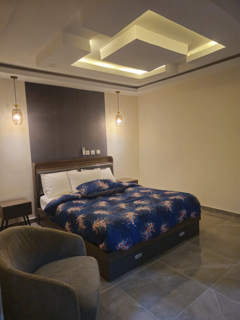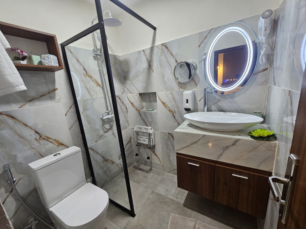 Modern and fully furnished 1-bedroom apartment featuring a comfortable living room, a fully equipped kitchen, and a contemporary shower. Ideal for couples or business travelers, with complimentary gym access throughout your stay.